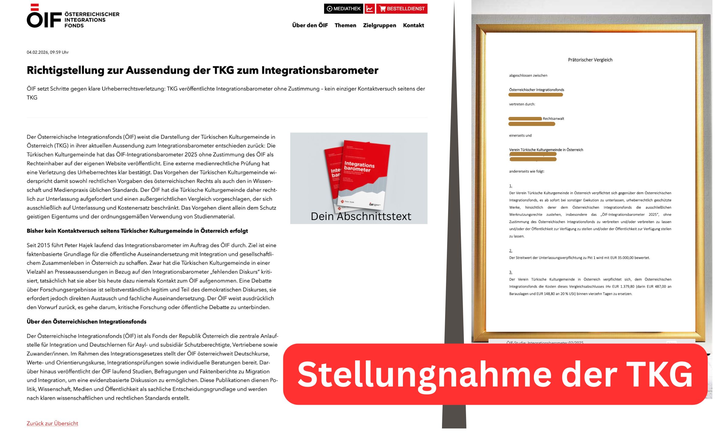 „Der Verein Türkische Kulturgemeinde in Österreich verpflichtet sich gegenüber dem Österreichischen Integrationsfonds, es ab sofort bei sonstiger Exekution zu unterlassen, urheberrechtlich geschützte Werke, hinsichtlich derer dem Österreichischen Integrationsfonds die ausschließlichen Werknutzungsrechte zustehen – insbesondere das ‚ÖIF-Integrationsbarometer 2025‘ – ohne Zustimmung des Österreichischen Integrationsfonds zu verbreiten und/oder verbreiten zu lassen und/oder der Öffentlichkeit zur Verfügung zu stellen und/oder der Öffentlichkeit zur Verfügung stellen zu lassen.“