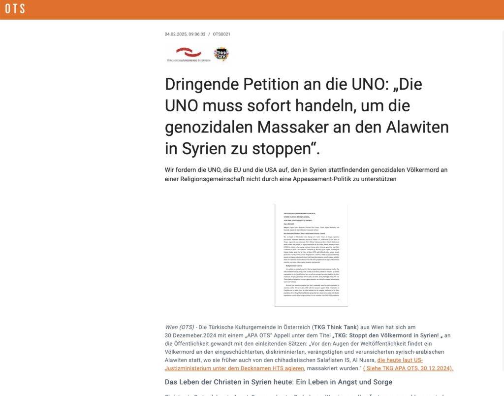 APA OTS, 04.02.2025 TKG: „Dringende Petition an die UNO: ‚Die UNO muss sofort handeln, um die genozidalen Massaker an den Alawiten in Syrien zu stoppen.‘“