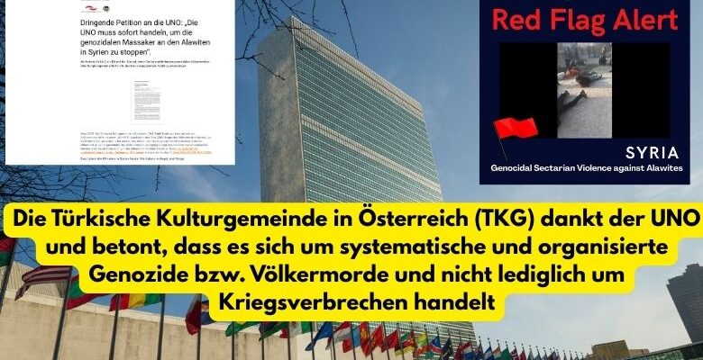WIEN.Die Vereinten Nationen (UNO) bezeichnen die Massaker an den Aleviten in Syrien als „mögliche Kriegsverbrechen“. Die Türkische Kulturgemeinde in Österreich (TKG) dankt der UNO und betont, dass es sich um systematische und organisierte Genozide bzw. Völkermorde und nicht nur um Kriegsverbrechen handelt.