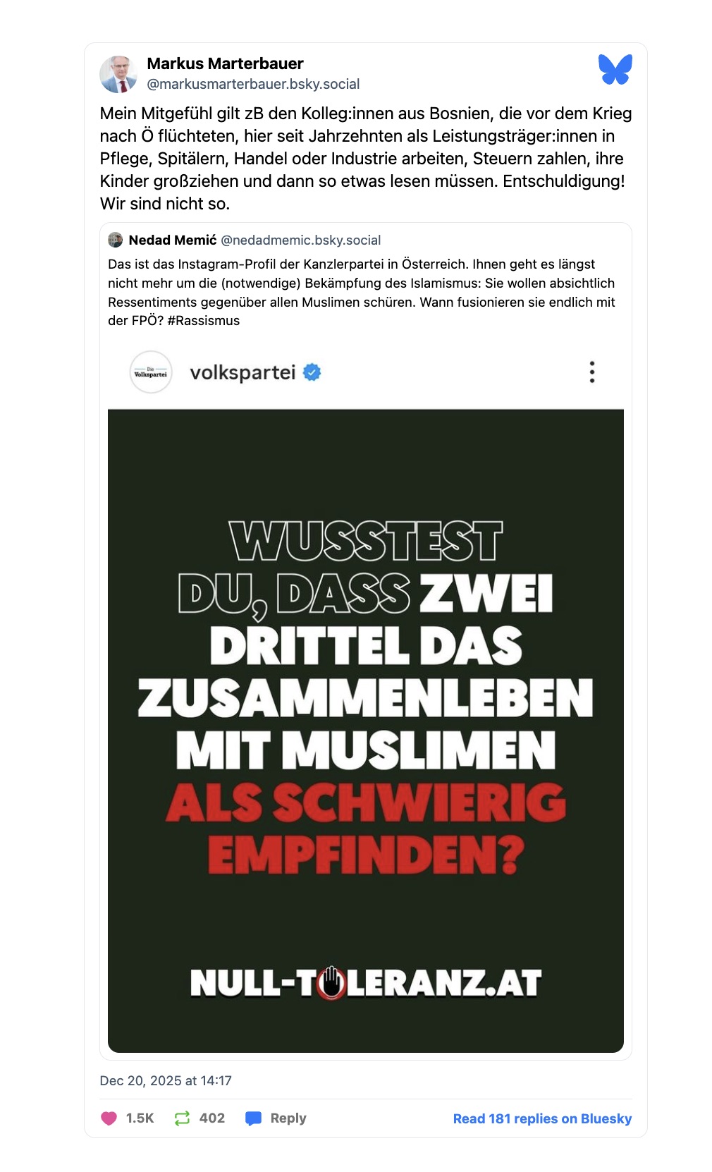 Wenn staatliche Stellen und Steuergelder – getragen von allen Bürgerinnen und Bürgern Österreichs – für politisch anschlussfähige, methodisch bedenkliche Meinungsforschung eingesetzt werden, trägt die Regierung Verantwortung: für Konzeption, Wirkung und Weiterverwendung. Werden in solchen Erhebungen religiöse Minderheiten durch kollektive, suggestive Fragelogiken problematisiert und anschließend parteipolitisch weiterverwertet, darf eine wehrhafte Demokratie nicht schweigen. Es ist ihre Pflicht, rechtsstaatliche und gesellschaftliche Grundprinzipien zu schützen.