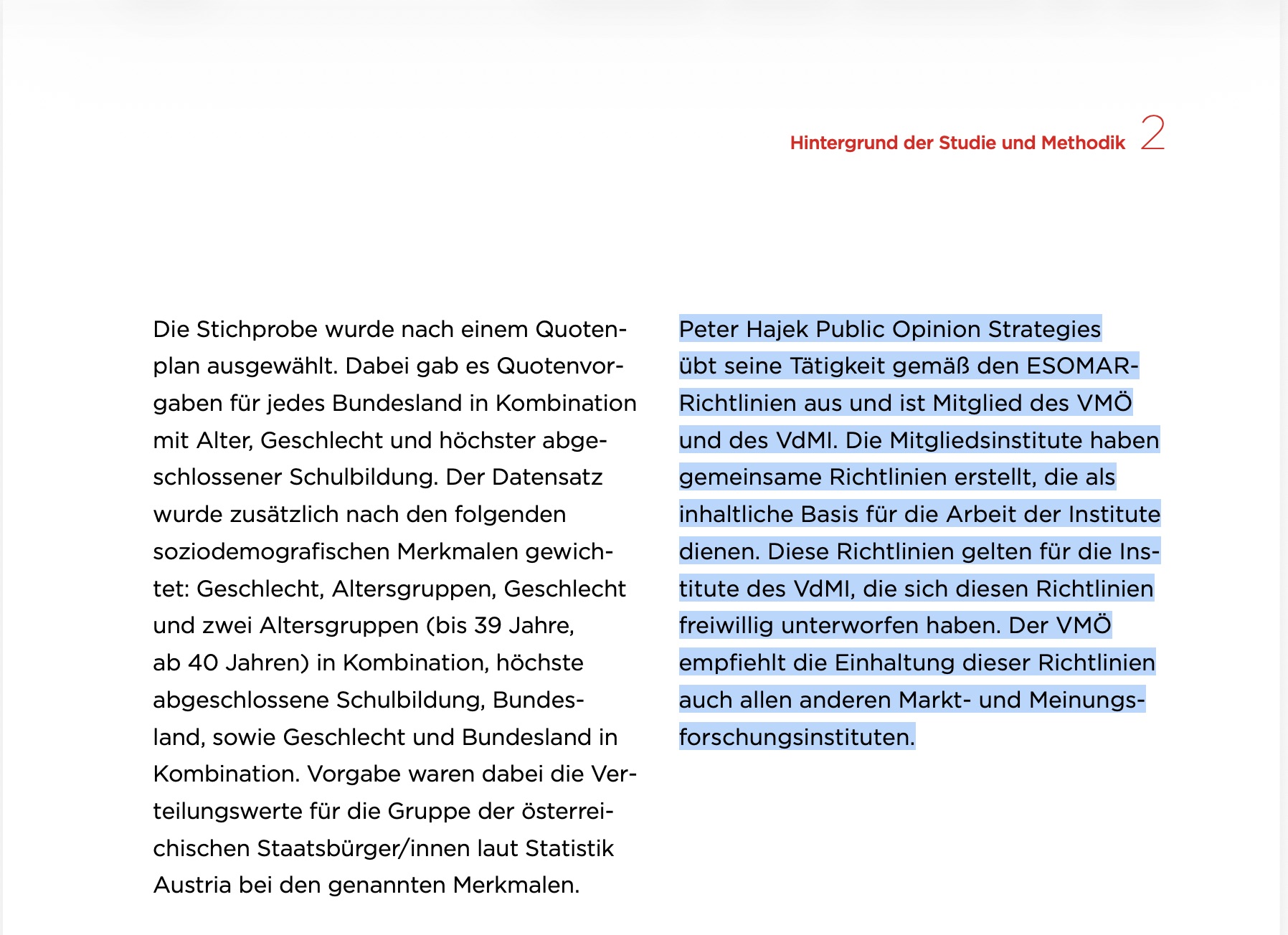 Im Integrationsbarometer selbst heißt es auf Seite 11: „Peter Hajek Public Opinion Strategies übt seine Tätigkeit gemäß den ESOMAR-Richtlinien aus und ist Mitglied des VMÖ und des VdMI.“