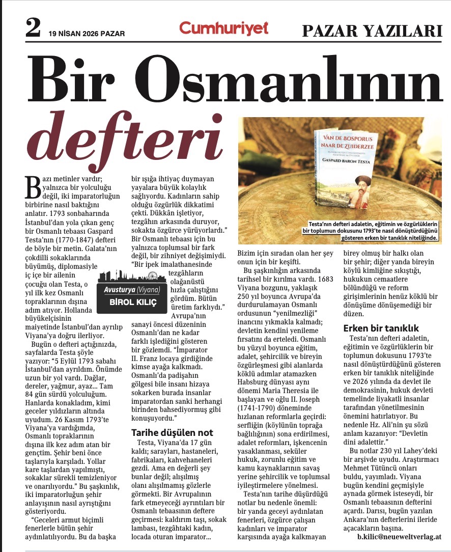 Am 19. Mai 2026 veröffentlichte die säkulare und investigative türkische Qualitätszeitung Cumhuriyet (Die Republik) auf ihrer renommierten Kultur- und Gesellschaftsseite einen Artikel des Wiener Verlegers und Obmanns der Türkischen Kulturgemeinde in Österreich (TKG Think Tank),
